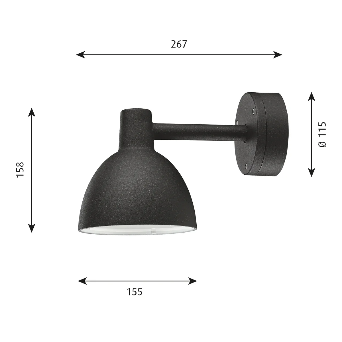 Toldbod 155 is een armatuur waarvan het ontwerp is gebaseerd op de PH elliptische reflector. Louis Poulsen Daarmee straalt de wandarmatuur een niet-verblindend, neerwaarts licht uit. De witte binnencoating van de Toldbod wandlamp zorgt voor een goede reflectie en dus een efficiënte lichtuitstraling.