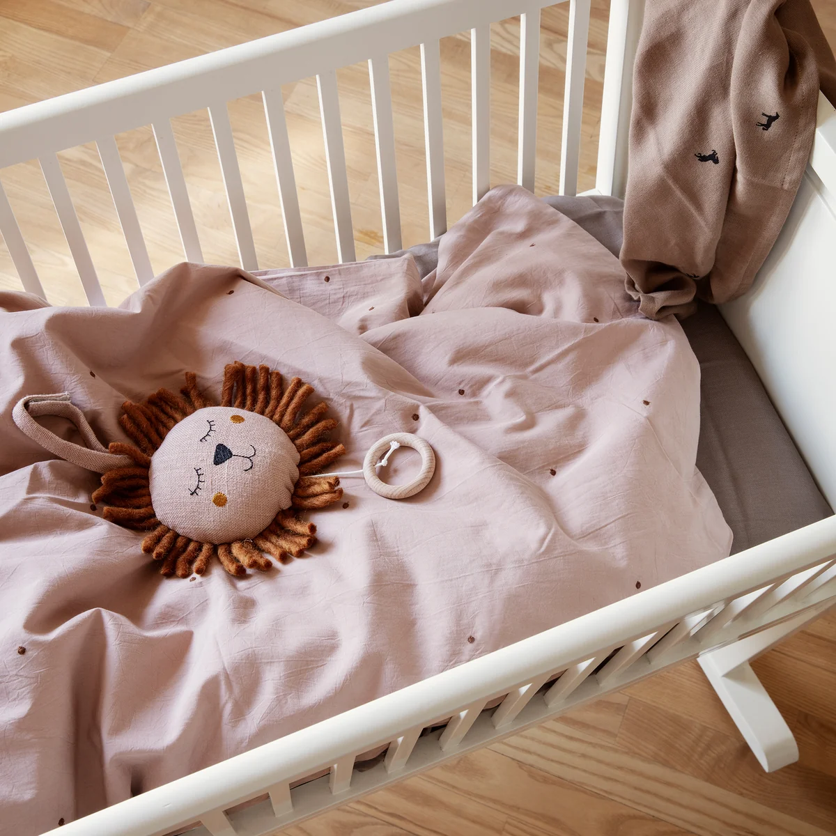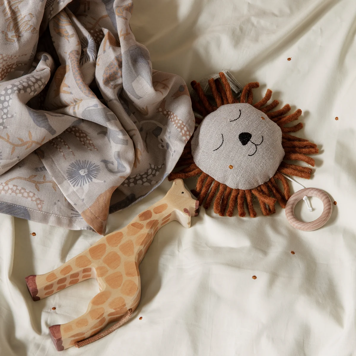 De hoes van de leeuw is gemaakt van natuurlijk linnen en de vulling is gemaakt van gerecycled polyester. Verkrijgbaar in verschillende kleuren, de muziekdoos past zich perfect aan in elke kinderkamer.