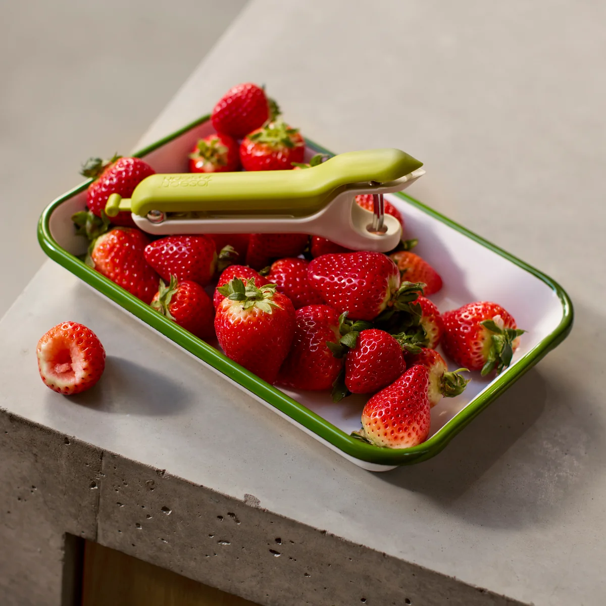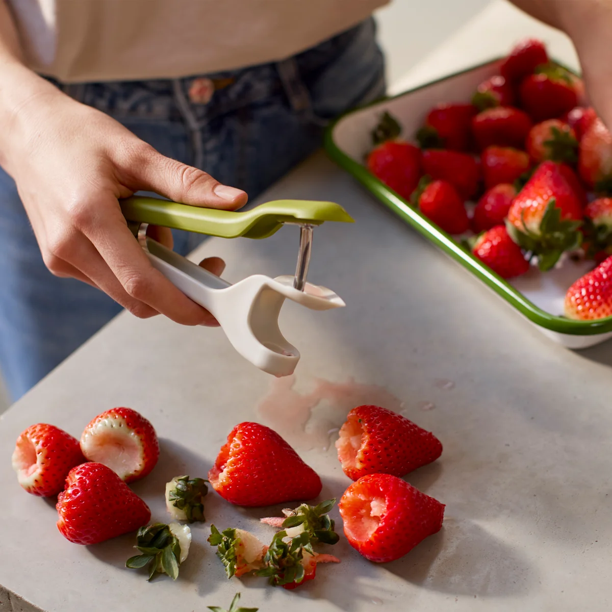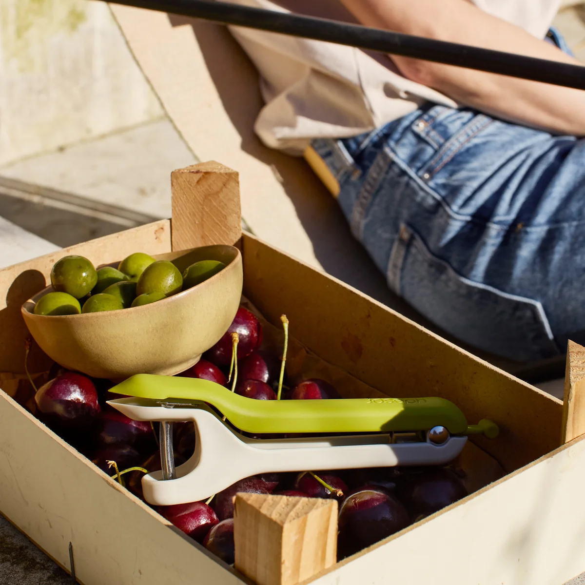 De Tweezy 2-in-1 ontpitter van Joseph Joseph biedt een veilig en efficiënt alternatief voor het werken met messen bij het ontpitten en verwijderen van steeltjes uit fruit. Hij is ideaal voor het ontpitten van kersen en het verwijderen van steeltjes en steeltjes uit aardbeien en kan ook gebruikt worden voor sommige olijven.