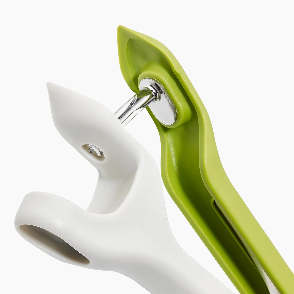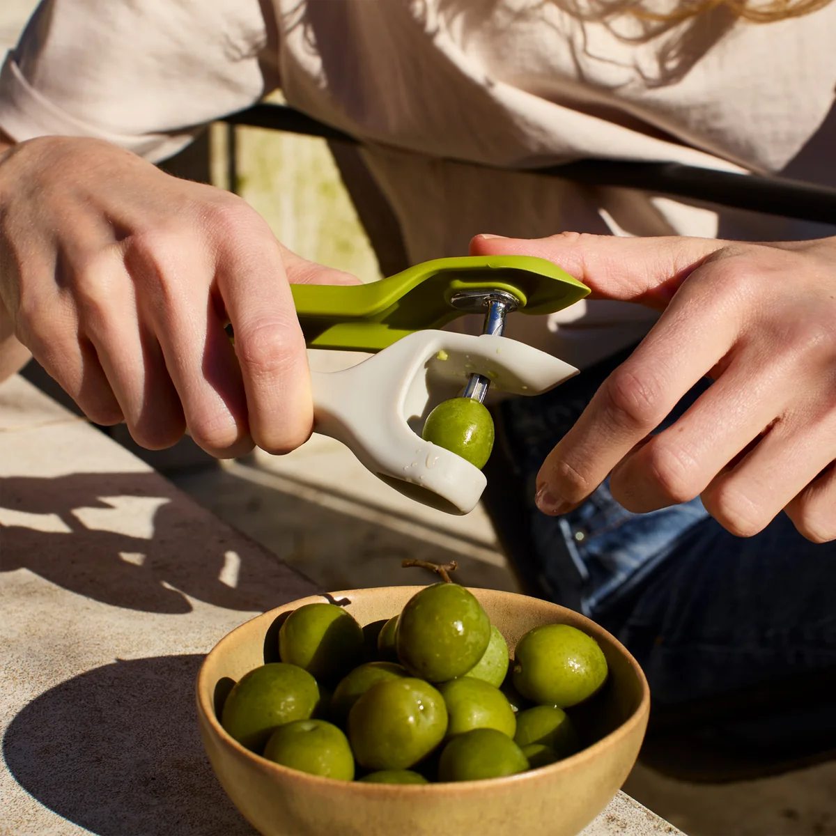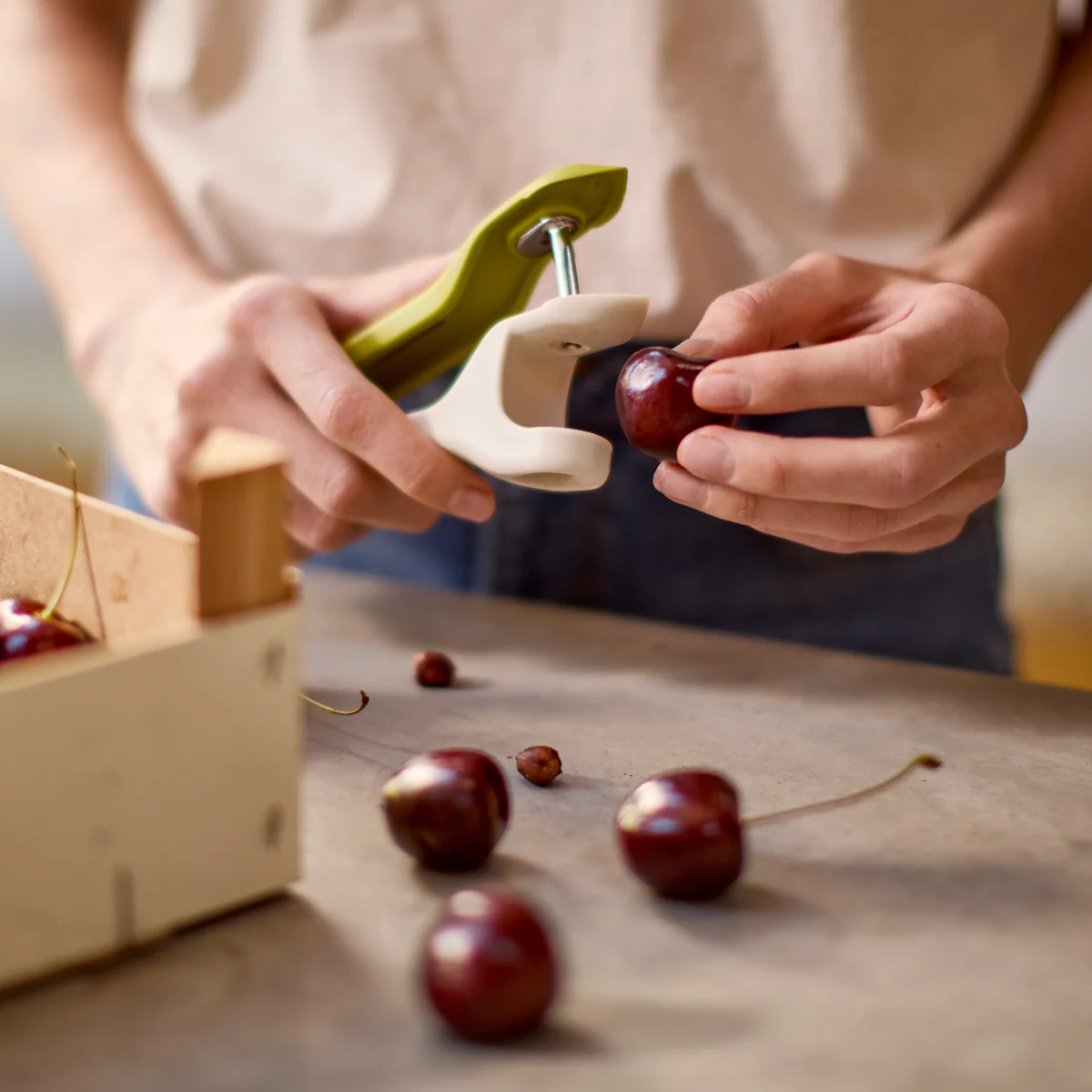De Tweezy 2-in-1 ontpitter van Joseph Joseph biedt een veilig en efficiënt alternatief voor het werken met messen bij het ontpitten en verwijderen van steeltjes uit fruit. Hij is ideaal voor het ontpitten van kersen en het verwijderen van steeltjes en steeltjes uit aardbeien en kan ook gebruikt worden voor sommige olijven.