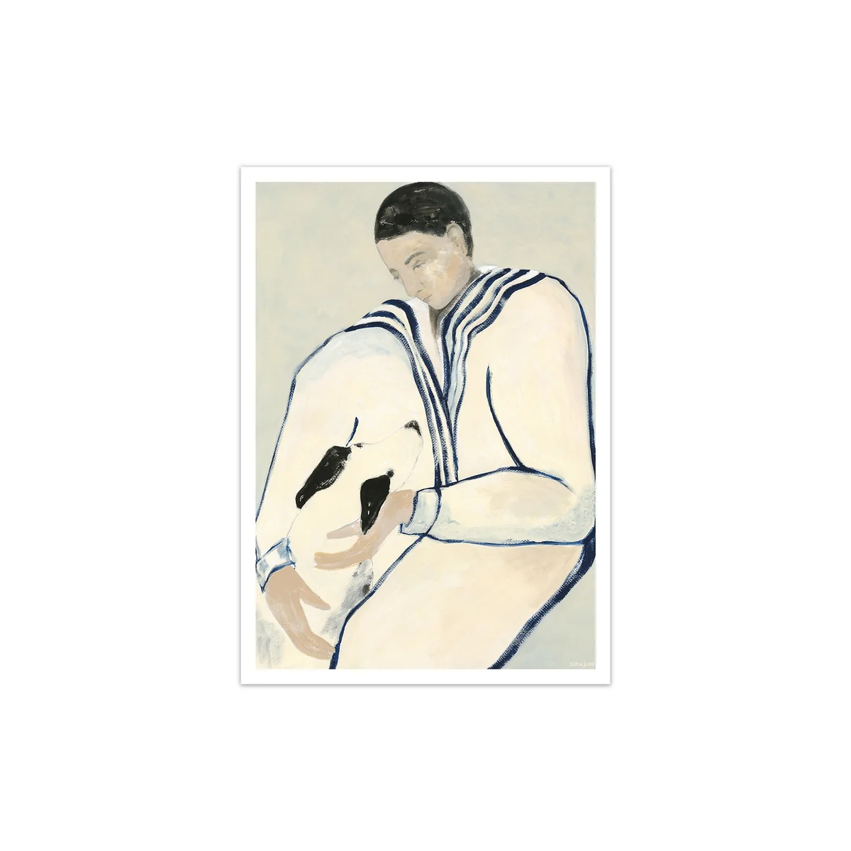 De Man en Hond kunstdruk van Sofia Lind voor The Poster Club. Gedrukt op 265 g natuurlijk, hoogwaardig kunstpapier met een mat, ongestreken oppervlak en een licht gestructureerd oppervlak voor levendige kleuren. Geproduceerd in Denemarken.